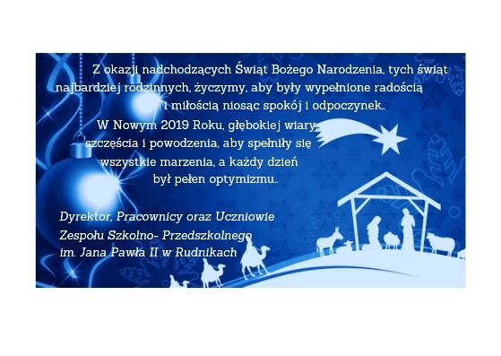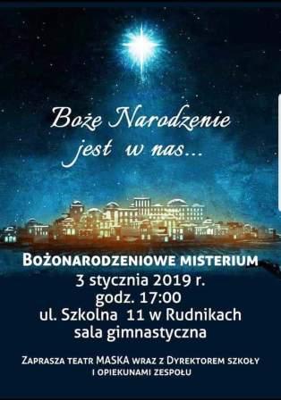W zimowe popołudnie 3 stycznia 2019r. w Zespole Szkolno- Przedszkolnym im. Jana Pawła II w Rudnikach zostało zaprezentowane dla społeczności lokalnej misterium bożonarodzeniowe, przygotowane przez szkolny teatr MASKA, działający z sukcesami już 17 lat. W progach szkoły dyrektor Pan Dawid Krzętowski, opiekunowie MASKI Panie: Iga Długoszewska- Zawadzka i Agnieszka Krzynowek oraz Pani Marlena Plewa, która przygotowała oprawę multimedialną spektaklu, powitali licznie przybyłych mieszkańców gminy, księdza Zdzisława Simińskiego- proboszcza parafii pod wezwaniem Miłosierdzia Bożego w Rudnikach, rodziców, babcie, dziadków, absolwentów szkoły, pasjonatów sztuki. Po raz kolejny okazało się, że teatr łączy pokolenia. Przedstawienie było artystyczną podróżą do prapoczątków, stanowiło pretekst do refleksji nad współczesnym światem, nad kondycją moralną człowieka, ale również dało okazję do wspólnego, radosnego kolędowania.